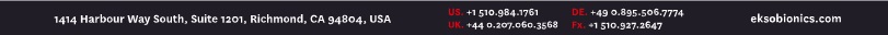 Ekso Bionics is headquartered in Richmond, CA and is listed on the OTC QB under the symbol EKSO. To learn more about Ekso Bionics please visit us at www.eksobionics.com